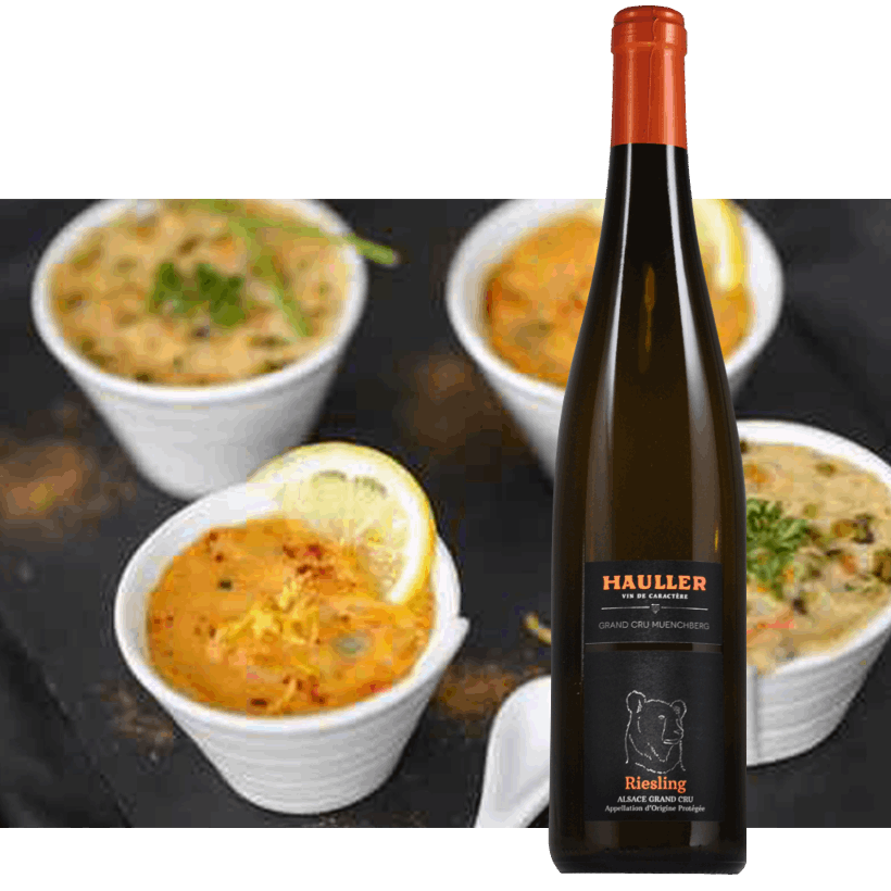 Accord mets et vin : Terrine de Saint-Jacques, filet de sandre à la crème, tarte au fromage.